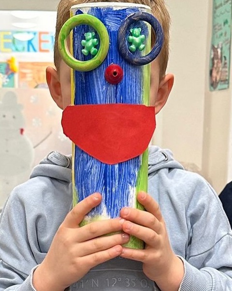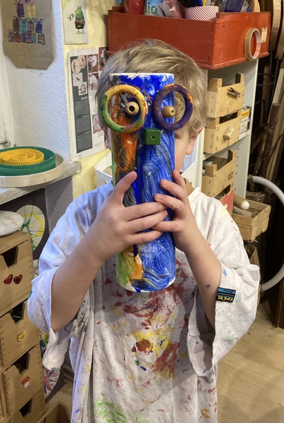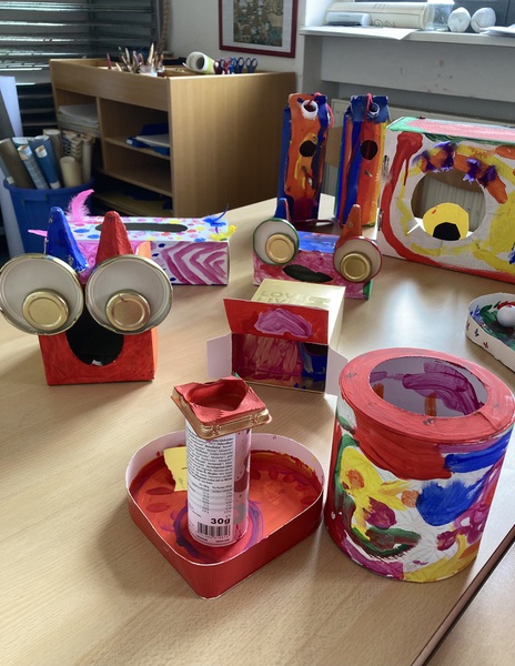 Schnappt euch leere Kartons,Toilettenrollen, kleinere Schachteln, Gardinenringe, Knöpfe, Styroporkugeln, Pfeifenreiniger, Blechdeckel,